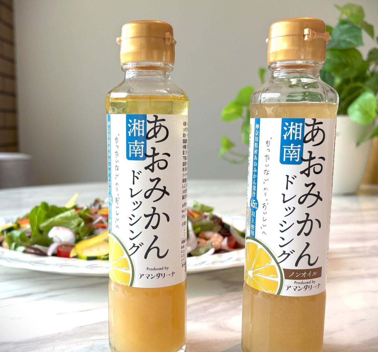 神奈川県産あおみかん果汁を48%使用した、果実味あふれる無添加のドレッシングです。オイル入りとノンオイルの2種類があります。組み合わせも自由にお選びいただけます。
